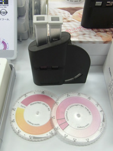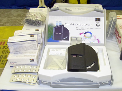 残留塩素濃度測定用 チェックキットエタニ産業株式会社 藤園商事株式会社(出展社) 基準色のディスクを交換することで、残留塩素濃度だけでなく、様々な測定に用いることのできる水質検査キットです。 2本テストセル(サンプル採水用容器)に検査対象を採水して、一方に検査薬を投入。投入した方を本体の右側、そのままの水を左側にセットしたら、測定ディスクを回転させて、反応色と測定基準色の比較を行います。 この製品の特徴は、測定基準の色調を示すのに、円盤状のディスクを用いていることです。 ディスクには基準色が、数値毎の単色ではなく、グラデーションで表示されているので、検体の反応が曖昧な場合にも、適当な基準色を探ることができます。また、その適合した位置を基にすれば、従来品より細かな数値が求められるな場合にも、対応することができるでしょう。 もうひとつの特徴は、円盤状の測定ディスクを交換すれば、様々な検査に用いることができる点です。