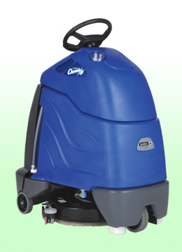 ステップオン(立ち乗り)搭乗式にすることで、本体サイズが手押し歩行式並みに小型となっており、小規模施設の狭い通路や、商店の商品棚の間などでも作業できます。