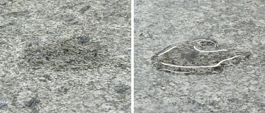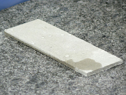 (左写真)右半分のみに『アクアバルーン』を塗布して、完全乾燥させたサンプルボードです。中央を境に僅かな色調の変化が見られます。 コンクリートや石材に塗布すると、表面にある微細な穴から内部に浸透して防水層を形成します。この防水層と表面の撥水効果を併せることで、強力な防水能力を発揮することができるのです。 たいていの撥水剤では、数ヶ月も経つと劣化して、高圧洗浄した時に素地が水を吸ってしまいますが、『アクアバルーン』の防水効果には文字通り厚みがありますので、防水効果が長期間持続します。そのため施工からある程度経っている場所でも、染み込みの心配をすることなく高圧洗浄を行えるでしょう。 |