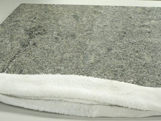 (右写真)これまでとは違うサンプルで実験してみました。 こちらの方が、表面が荒く、水や汚れがつきやすいと同時に、単色なので汚れが目立ち易い素材です。 まずは水滴を垂らしてみると、無加工の部分では水が浸透しているのに対して、『アクアバルーン』を塗布した部分では撥水・防水効果が発揮されています。 |