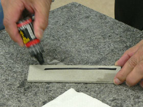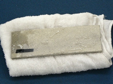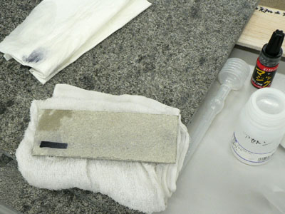 (左写真)『アクアバルーン』の使用量は、1㎡あたり50ccが目安です。 今回の実験では、ボードのサイズ[40cm×40㎝]の半面を利用しますので―― [(0.40×0.40)÷2]×50=4 ――で、約0.16㎡に対して4ccを塗布することになります。 (左下写真) 適量を塗り込むようにして広げます。素地表面の穴や凹みにも十分入り込むようにしてください。 (下写真) 元が乳白色の液体なので、塗った直後は色の違いが見られますが、乾燥すれば落ち着いて目立たなくなります。 |