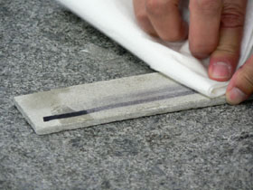 (上写真から)今度はマジックで落書きをしてみます。 アセトンを含ませたティッシュで拭ってみると、『アクアバルーン』を塗布した部分だけ、簡単に拭い取ることができました。このように落書き対策にもなります。 (下写真) マジックを拭い落とした後、再び水滴を垂らしてみましたが、ご覧の通り、撥水・防水効果に衰えは見られません。 |