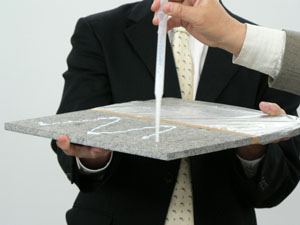 (上写真)ボードの表面に水を垂らしてみました。 無加工の左側では素地に水が染み込んでいますが、右側は『アクアバルーン』を塗布したために撥水効果が現れています。 (右写真) ボードを傾けてみました。 撥水効果がある右側の水は転がるように流れ落ちてしまい、その痕跡もみられません。 水が入らないということは、汚水の染み込みが起きないということです。これが「汚れにくい」「某汚効果がある」ということにつながります。 |