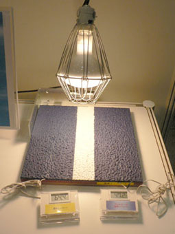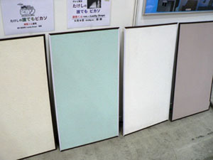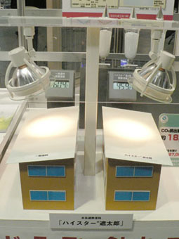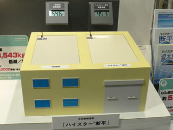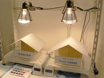 | 遮熱塗料各種 今回、大小様々な展示がある中から、紹介内容に「建築後でも簡単に導入できそうな品」を念頭において見学していたところ、なんとなく遮熱効果や断熱効果のある塗料が集中してしましました。 それぞれ、ある種の光を遮断したり反射することで、熱の蓄積と、それに伴う熱放射を防ぐ……といった効果を発揮します。 熱放射を防いで室内温度の上昇を抑えることで、特に夏場のエアコン出力を下げることができるようになります。もちろんエアコンの出力を下げる以前に室温が抑えられているのですから、なんら我慢する必要はありません。紫外線遮断ガラスなどと併用すれば、さらに効果的です。 こういった工夫により、ビル単位でエアコン出力を最適化することができれば、その経費削減効果はかなりの金額になります。 今回、たまたま複数の商品を紹介することになりましたが、ここで商品の比較をすることは本分ではありませんし、その良し悪しを判断することもできません。導入には各企業の資料を詳しく検討して、ご自身で最適な商品を決定してください。とはいえ、それぞれ特性がありますから、単一商品ではなく適材適所で用いるのが最良かと思います。 |