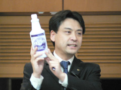 | 講義3:『床材におけるメンテナンス方法』 複合フローリング市場における傾向とメンテナンス上の問題点 株式会社リンレイ 片岡 氏 最近のフローリング製品の変化と、それにともなうトラブルの発生と対策について、ワックスメーカーの視点での解説がありました。 ここ数年で、複合フローリング製品には、内側にも外側にも、様々な変化が起きているそうです。 まず内側、板そのものの材質が変化しました。 かつて広葉樹だった合板の材料は、資源の枯渇によって針葉樹になり、さらには成長が早い植林木の針葉樹が主流になりました。 ところが、針葉樹の木質は広葉樹よりも柔らかく、植林木ならさらに柔らかいのです。 そして外側では、板材の表面塗装が”ウレタン塗装”から、表面が硬く傷に強い”UV塗装”に、さらに硬い”高硬度UV塗装”へと、どんどん硬く変わってきました。 結果的に、中身の素材は柔らかく、表面の塗装は硬くなってきたことになります。 こういったフローリング製品の性質変化、特に硬い表面塗装によって、いろいろなトラブルが起きるようになりました。 いずれも主な原因は、ワックスの密着不良と水の存在です。 表面塗装の変化によって、従来のワックスでは密着不良が起きるようになりました。密着不良のワックスと床面の間に水が入り込むと、白化や剥がれなどのなどのトラブルが発生します。 トラブルの生じたワックスは、剥離するしかありません。ところが、剥離作業で使用した水がフローリングの板材に入り込むと、今度は板材そのものを変形させ、しまいにはフローリングの貼り替え、そして賠償ということになるかもしれないのです。 どうしても剥離しなければならない場合は、作業による影響の有無を確認しておきましょう。 ノーワックスを謳ってる製品でも、経年によって傷などが増えてくると、ワックスを使う必要が出てきます。 ワックスを塗布する前には、対象となるフローリングの性質を十分に調べて、材質に適合するワックスを使用しましょう。 ここで他の場所と兼用で汎用ワックスなどを使用していてトラブルになった場合、作業対象に適合しない、たとえば木床用ワックスを使っていなかったら、それで裁判に負けるかもしれません。 また、家庭用のフローリングは、床面と顔が近くなることがあるので、傷や汚れが目につきやすく、ちょっとした糸くずなどがクレームの原因になることがあります。ワックスを塗布の段階で、作業方法や道具にも注意が必要です。 ワックスの密着不良によるトラブル