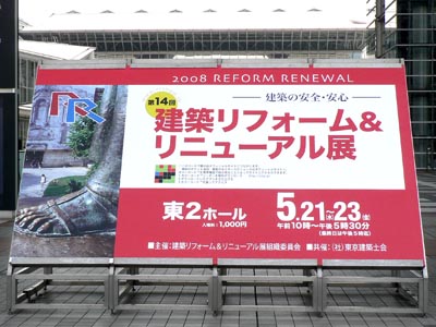 第14回 建築リフォーム&リニューアル展 主催:建築リフォーム&リニューアル展組織委員会 共催:(社)東京建築士会 会期:2008年5月21日~23日 会場:東京ビックサイト 既存建物の改装や、機能付加をテーマにした展示会が開催されました。 当サイトでは一昨年の開催時にも見学しておりますが、その時に比べると、展示規模が大幅に縮小されたようです。 出品内容については、耐震補強工事や隙間充填剤、撥水・防汚・断熱など様々な機能を持った壁材や塗料、UVカットガラスや貼り付けフィルムなどの定番商品が、大小様々なメーカーから出品されてました。