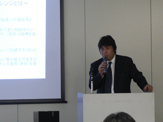 | 大阪知的障害者雇用促進建物サービス事業共同組合(エル・チャレンジ) 丸尾 氏 1999年の設立当時、身体障害者の雇用率はあがっている一方で知的障害者の雇用率は下がる傾向がありました。 エル・チャレンジは設立以来、行政、企業、福祉の間に立った支援機関として、就労が難しい知的障害者の就労支援を目的に活動しています。 養護学校や支援団体などからは、就職希望者や訓練生の受け入れを。企業との間では、障害者雇用についての相談や、就職後の定着の支援などを行っています。 エルチャレンジでは、障害者の就労支援というだけでなく、社会に出た後に障害者が困ったり戸惑ったりすることのないよう、まず、社会に通用する技術を習得してもらい、また、社会人としての必要な社会技術(挨拶や道徳、身辺自立など)を、生活レベルから分析し、個人の状況に応じて必要な技能を習得できるように工夫しています。 平成9年~11年の調査では、就職1年での平均離職率は約16%で、3年後まで続いてる人は64%、逆に言えば、36%が3年で離職しています。 こういった状況の下、障害者が就職するのを支援するとともに、働き続けられる(職場に定着できる)環境を整えることに力を注いでいます。 設立から9年で300人ほどを送り出し、9割が職場に定着して働き続けているそうです。 障害者の立場に立った、企業としての業務の遂行に何が必要か ・少しの配慮や工夫があれば、障害者は働くことができる。 ・障害者の側に立った視点。 ・企業と障害者は、対立するものではなく、快適な労働環境を作り上げるパートナーとなること。 ・障害者が働きやすい職場は、障害のない人にとっても快適な職場となる。 就労支援ワーカーが担うべきこと ・企業と障害者の間に立って、調整を進めるコーディネーターであること。 ・企業の業務遂行と、障害者の人権は対立するものではなく、目的は同じ。 ・これをうまくコーディネートする、就労支援の専門家であること。 最後に、総合評価一般競争入札制度について、お話がありました。 せっかく1年かけて現場に定着しても、入札で負けてしまえば職を失ってしまいます。 これを少しでも改善するのが総合評価一般競争入札制度で、価格と価格以外のいくつかの要素を総合的に評価し、発注者にとってもっとも有利な者を落札者とします。 これは、大阪府の目指す『行政の福祉化』を進め、入札の基準を『金額基準から社会的価値基準へ』と変える制度です。