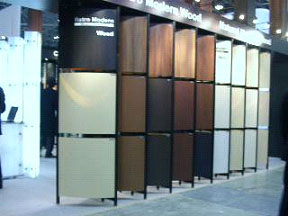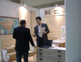 写真1:中国産桐の売り込み最近の建築素材展では、カーぺットやビニールタイルなどの展示はほとんどない。これらはインテリアトレンド展に出ている。また、数年前から、大手はネットで情報を流し、カタログ、価格表などは登録すればダウンロードできる体制にある。しかし、まだ現物とカタログのギャップがあり、色調、足ざわり、など感覚的な部分は展示会で確認せざるを得ない。 全般的な流れは、やはりフローリングである。数年前からカーぺットメーカーはカーぺットルネッサンス運動をはじめているが、まだまだ十分とはいえない。カナダ、アメリカなどのフローリングの売り込みは政府の後押しでかなり大々的である。天然石材はエジプトが大きな小間を取り、ライムストーンの売込みを行っている。天然石材より天然石材風の陶磁器の展示が多く、これは価格の点で今後のビルに普及する可能性が大きい。 |
