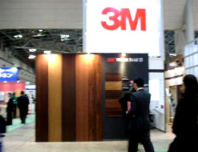 写真4:最大の小間取りをした3Mは、床、壁面、スチールドア、ガラスなど、あらゆるものを対象にした各種シートを販売していた。リニューアルは大きな市場と判断しているのであろう。 このような張物は、無垢材との見分けに注意が必要で、同社のフロアパットでの洗浄がクレームになりかねない。事業部が異なり、販売ルートも違うため、確認を必ず行う。またシミヌキ剤によるクレームも増加している。 |